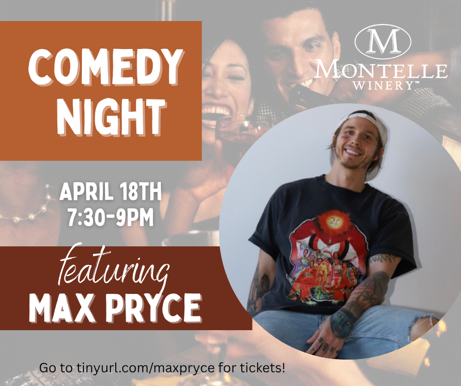 Join us for an unforgettable evening of comedy and good vibes at Max Pryce Comedy Night—happening live at Montelle Winery! Grab your friends, sip on your favorite pours, and get ready for a night full of laughter.